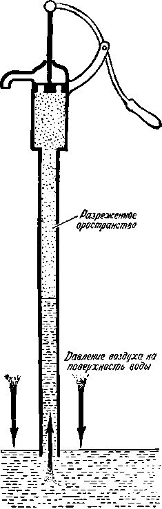 Вода следует за поршнем при его подъеме только до тех пор, пока давление столба воды не уравновесит давление воздуха. После этого между столбом воды и поршнем, если его продолжать поднимать, остается пустота. И эту пустоту вода не может заполнить: ведь наступило равенство давления воздуха и поднявшегося столба воды.