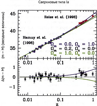 На рисунке — диаграмма Хаббла для далеких и близких сверхновых, опубликованная в статье Группы поиска далеких сверхновых. Сверху — диаграмма Хаббла как она есть, снизу — отнормированная на «нулевую гипотезу». В качестве последней авторы приняли плотность материи (обычной и темной) 0,2 от критической (?m = 0,2), как показывали в то время данные наблюдений, и предположение, что больше во Вселенной ничего нет.