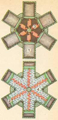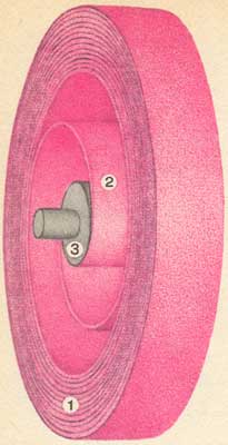 «Мягкий» супермаховик: 1 - внешний моток ленты; 2 - промежуточные витки ленты; 3 - барабан.