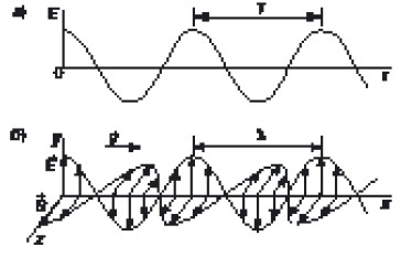 Из (1) непосредственно следует, что имеет место распространение электромагнитной волны, так как изменения векторов ? и B происходят по закону косинуса, аргумент которого зависит линейно от времени и координаты. Если зафиксировать координату и посмотреть, как изменяется ? со временем, то можно убедиться, что эти изменения происходят по закону косинуса с периодом T (рис. 1, а). А если мгновенно сфотографировать в момент времени t распределение векторов ? и B вдоль координаты x, то можно убедиться, что эти векторы меняются по координате также по закону косинуса с периодом, равным длине волны ? (рис. 1, б).