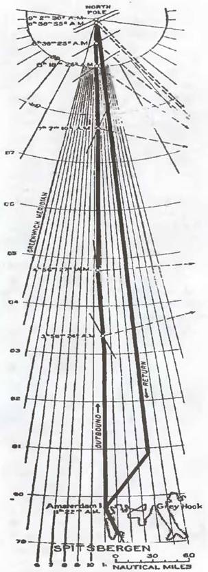 СХЕМА ПОЛЕТА, СОВЕРШЕННОГО ЛЕЙТЕНАНТОМ РИЧАРДОМ ЭВЕЛИНОМ БЭРДОМ С ШПИЦБЕРГЕНА К СЕВЕРНОМУ ПОЛЮСУ 9 МАЯ 1926 ГОДА.