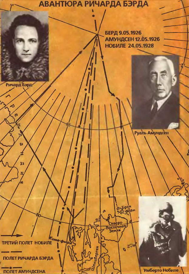 Вот так Руал Амундсен, столько лет пытавшийся первым достичь Северного полюса, буквально в последнюю минуту отдал славу другому. За два дня до старта дирижабля «Норге» американцы Бэрд и Беннетт взлетели на своем самолете со Шпицбергена и направились на север, а через пятнадцать с половиной часов вернулись назад.