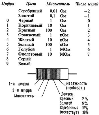 Маломощные проволочные и пленочные резисторы с допуском от 2 до 20 % имеют стандартные значения сопротивлений и стандартную схему цветной маркировки. У начинающего это может вызвать подозрения, но на самом деле такая маркировка позволяет легко определить сопротивление стоящего в схеме резистора по его цвету, а не по цифровой маркировке, которую не сразу разглядишь. Стандартные значения сопротивлений резисторов выбраны так, что смежные значения отличаются на 10 % для резисторов с допуском 2 и 5 % и на 20 % для допусков 10 и 20 %. С помощью цветной маркировки можно задать многие значения сопротивлений, но не все они существуют на практике.