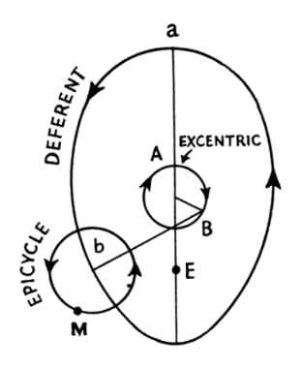 На представленном выше рисунке ступица Колеса Обозрения движется по часовой стрелке по малой окружности, от "А" до "В"; точка на ободе, к которой подвешена кабина, движется против часовой стрелки по яйцеобразной кривой от "а" к "b"; сама же кабина вращается вокруг результирующего эпицикла. Но этого еще недостаточно; в случае некоторых непокорных планет было установлено, что к первой кабине нужно подвесить другую кабину, которая движется по другому радиусу и с другой скоростью; а потом еще и третью, четвертую и пятую, пока пассажир в окончательной кабине не станет описывать траекторию, более или менее совпадающую с той, которую он должен был описывать.