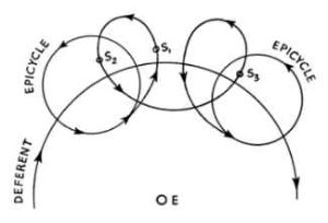 Если глядеть с Земли, которая находится в центре Колеса Обозрения, планета – пассажир в кабинке будет перемещаться по часовой стрелке до тех пор, пока не достигнет "точки остановки" S1, после того она начнет пятиться назад против часовой стрелки до точки S2, потом снова будет двигаться по часовой стрелке до S3 и так далее[56]. Обод Колеса Обозрения называется деферентом, а окружности, описываемые кабиной, называются эпициклами. Выбрав нужное соотношение между диаметрами эпицикла и деферента, а так же соответственные скорости для каждого элемента, стало возможным достичь хорошего приближения к наблюдаемым движениям планет в плане интересующих нас "остановок" и "попятного движения", а так же изменяющихся расстояний от Земли.