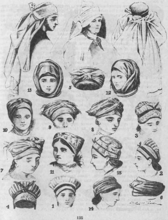 Барвисті хустки являють собою новину і на півдні України. Вони заступи ли собою старовинне біле головне вкриття в формі намітки чи обруса; про це свідчать малюнки Рігельмана, а також сам процес зміни, то відбувався та відбувається й тепер ще на наших очах. Так, у Кролевеиькому повіті на Чернигівщині ще літ 50— 60 тому, як переказують старі люде, замужні жінкн носили білі хустки, а тепер замісць того барвисті хустки. Те саме сталося й на Гуцулыцині, де, як свідчить Голембіовський, замужні жінки носили на голові «завої з тонкого білого полотна». Способи зав’язування барвистої хустки також незвичайно ріжноманітні. Мабуть, за найстаровинніший з них треба вважати обмотування хусткою цілої голови; при цьому хустку, як намітку, часто пропускають і під шию, так що з неї виступає тільки обличчя (табл. XI, 12 та 13). Далі, найчастіше обмотують хустку навколо голови; при цьому цікаве те, що тенденція поводитись із хусткою, як із наміткою, приводить до того, що, крім неї, зав'язують ще другу хустку таким способом, як це роблять, коли болять зуби (наприклад, у селі Бобровиці на Черни-гівщині). Коли хустку складають для зав'язування навколо голови, то між фалдами вкладають кусок паперу або лика, щоб передня частина хустки трималася рівно. Хустка, зав’язана таким способом, має форму зрізаного конуса, иноді досить високого (на Чернигівщині), або циліндричну форму (на Полтавщині та на Київщині), або низько циліндричну зі зв'язаними спереду кінцями на кшталт банта (західня Волинь), або таку саму форму, як І попередня, але з кінцями, спущеними на спину (західня частина Київщини), або також у формі циліндра, але сплющеного зверху, з переду назад таким способом, що циліндр виходить дуже розширений вгорі по боках (північ Київщини та Волині), тощо. Нарешті, на південній Київщині, на Поділлю та в гуцулів хустка часто прибирає форму чалми, досягаючи дуже великих розмірів, а хустка на Полтавщині має розмір найменший (табл, X, в).