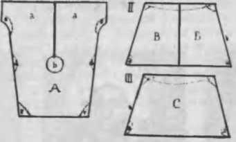 Кожух. Кати за примітивну форму одежі вважати кептар, то кожух, безперечно, дальший його розвиток, і це знову-таки спільна одежа і для жінок, і для чатовіків. Головаиький прямо говорить, що «верховинці (бойки) носять довгий кіптарь, а на рівнині до нього пришивають і рукава, так шо кіптарь перетворюється в кожух». На Київщині, як свідчить Чубннський, селяне відріжняють дві форми кожуха: кожух простий та кожух тулуб’ястий, і дуже цікаве те, що перший, простий, далеко складніший, ніж другий, тулуб’ястий, що його шиють без стану, без фалд тощо, а раніше шили й без рукавів. Простота першого полягає в тому, що його більше вживають (а ту-луб’ястнн кожух носять лише заможніші люде), та ще в тому, що вік старіший з походження, що виявляється і в його крої. Описуючи оброблення шкур та спосіб викроювання кожуха, ми згадували, що найбільша з потрібних для того кожушин іде на так звану перегинку, цебто верхню, основну частину цієї одежі; цю кожушину (А) перегинають удвоє, посередині на загині вирізують напівкруглий отвір (для шиї), потім розгинають та одну, трохи більшу, половину розрізують вздовж до шийного отвору. Таким способом, зігнувши кожушину иавпаки, матимем не шо инше, як добре відомий нам кептар. Далі, з другої розрізаної надвоє кожушини (В) пришивають дві передні поли, третя шкура (С) становить задні поли, з четвертої та п'ятої шиють бічні поли, а з шостої, також розрізаної надвоє, роблять рукава. Даіучений малюнок показує, до якої міри цей крой відповідає і формі кожушин, а також і формі одежі, шо її з них роблять (мал. 15).