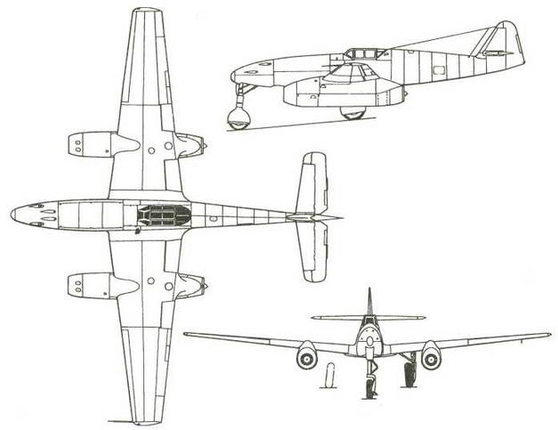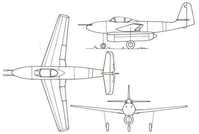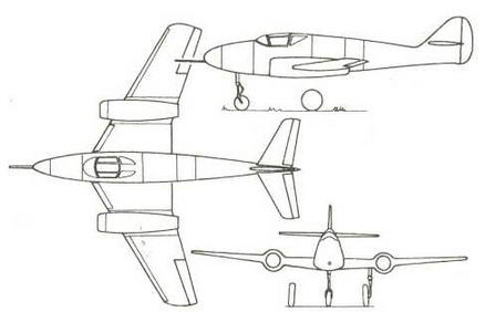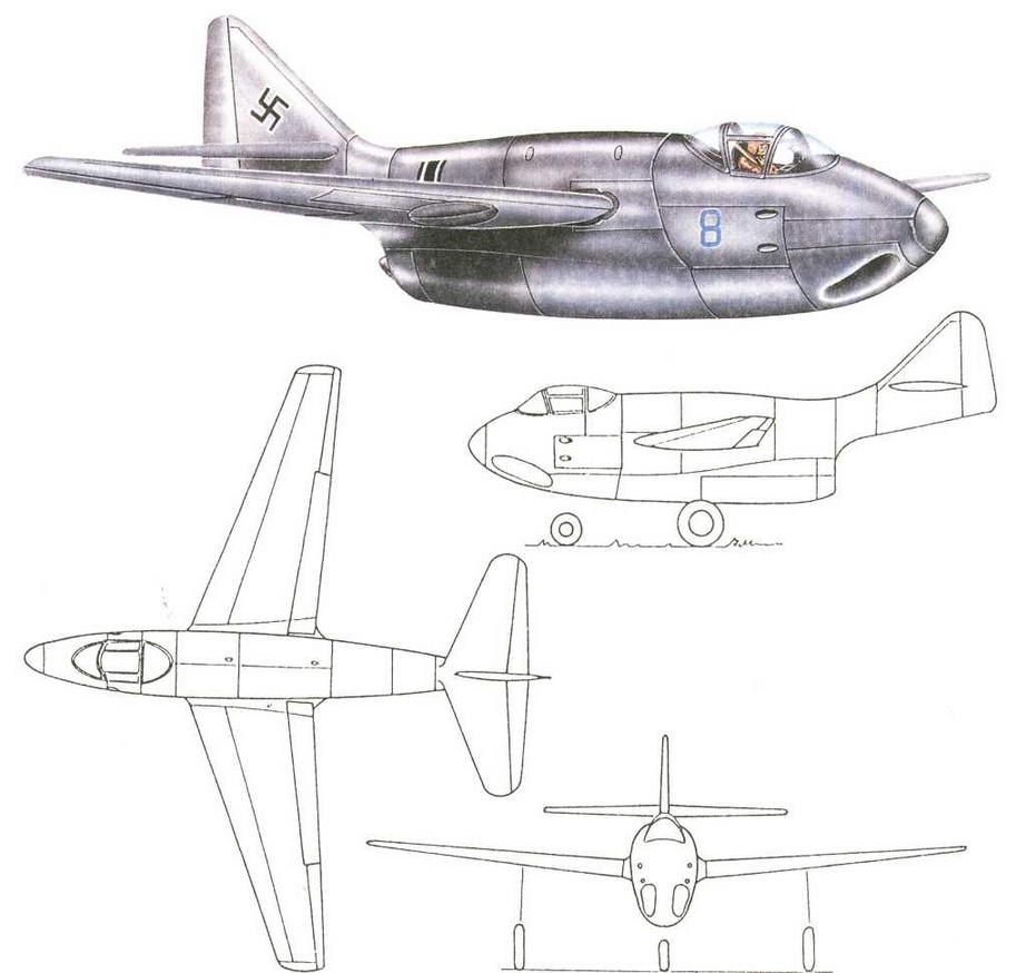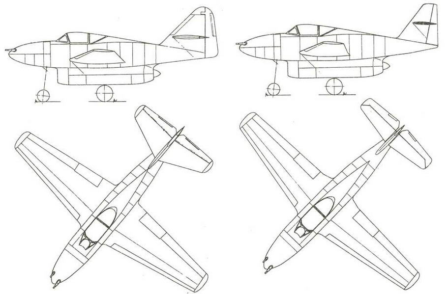 - пониженный фонарь кабины и - стреловидное горизонтальное оперение. Этот, в принципе новый, самолет был предметом многочисленных обсуждений, исследований и продувок в аэродинамической трубе. Его изготовление не могло быть осуществлено до капитуляции. Когда в конце 1944 г. появилась возможность установки более мощных двигателей, это, естественно, было включено в план работ.