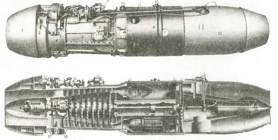 1. Лобовой обтекатель 2. Масляный бак 3. Передний кожух 4. Приборная панель 5. Корпус компрессора 6. Регулятор тяги двигателя 7. Прибор зажигания 8. Рычаг управления 9. Несущая оболочка 10. Узел подвески 11. Тяга реактивного конуса 12. Корпус сопла 13. Кольцевой топливный бак 14. Пусковой двигатель 15. Насос впрыска топлива 16. Вспомогательный привод 17. Насос подачи смазки 18. Фильтр смазки 19. Передний подшипник компрессора 20. Регулятор числа оборотов 21. Ротор компрессора 22. Фильтр топлива 23. Задний подшипник компрессора 24. Глушитель 25. Камера сгорания 26. Щелевой смеситель 27. Камера сгорания 28. Игла впрыска топлива 29. Коллектор 30. Сопловый аппарат турбины 31. Диск турбины 32. Передний подшипник турбины 33. Задний подшипник турбины 34. Привод реактивного конуса 35. Реактивный конус 36. Место конуса