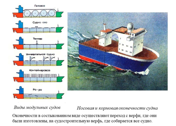 Суда, как правило, имеют постоянную (статическую) структуру: сухогруз, танкер и т. д. Разработана модульная (динамичная) конструкция судна, которая имеет носовую и кормовую части (оконечности), а в середину (среднюю часть корпуса) может помещаться любой модуль (рис. 2.10)41. Таким образом, собираются транспортные суда различного назначения. Модульные суда строили в США на Великих озерах.