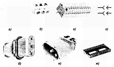 Соединители (или разъемы) имеют изоляционные основания, на которых закрепляются штыри (ножи) и гнезда, образующие контактные пары. Разъемы отличаются числом контактных пар, их конфигурацией и площадью, геометрическим расположением в пространстве, типом изолятора, способами крепления и фиксации и т. п. Преобладающими формами соединителей являются цилиндрические и плоские (рис. 33, ж). Поверхности ВЧ-разъемов для обеспечения малого сопротивления покрывают серебром и золотом. Для того чтобы обезопасить выход аппаратуры из строя («защита от дурака»), разъемы каждого типа часто имеют свои характерные ключи, например, вырезы в разъеме материнской платы персонального компьютера.
