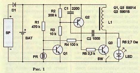 В заключение несколько практических советов для желающих повторить эту конструкцию. Для нее вполне подойдут отечественные транзисторы КТ315 и КТ361 с любыми буквенными индексами. Диод D1 может быть любым, с предельным током 40…60 мА. Марка датчика — фоторезистора неизвестна, по наверняка можно подобрать что-нибудь подходящее из имеющихся, измерив сопротивление на свету и в темноте с помощью тестера. Катушка L1 миниатюрная, по виду напоминающая резистор, индуктивность ее также неизвестна, но полагаю, что нескольких миллигенри будет достаточно. Можно намотать 100… 150 витков на ферритовом колечке или использовать одну из обмоток малогабаритного трансформатора. Полезны рекомендации, приведенные в упомянутых выше статьях.