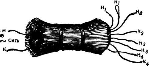 Рис. 73. Трансформатор ежового типа: Н и К — выводы от сетевой обмотки; Н1, Н2, Н3, Н4 — выводы от начала понижающих обмоток; К1, К2, К3, К4— выводы от концов понижающих обмоток.