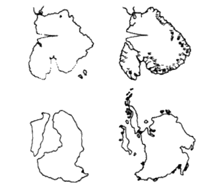 Наверху слева и справа копии карт Меркатора и Оронтеуса Финиуса, показывающие процесс оледенения Антарктиды. Внизу слева: копия карты Буаше. Внизу справа: подлёдная топография Антарктиды согласно современным данным сейсморазведки