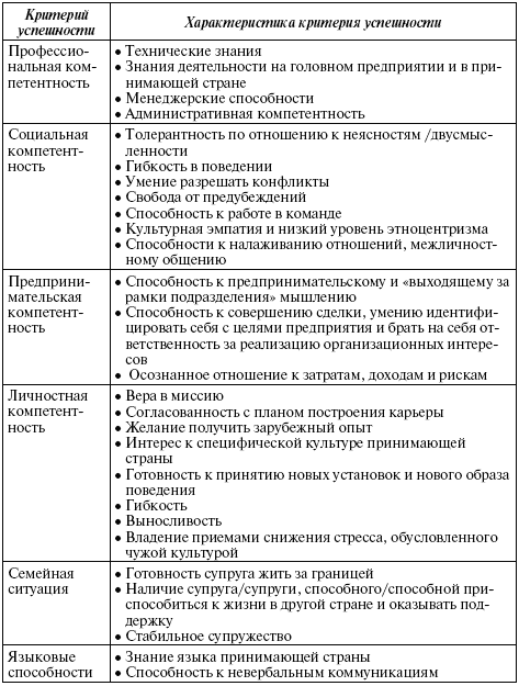 Успешность работника интернационального предприятия зависит от наличия у него профессиональной, социальной, предпринимательской и личностной компетентности, семейной ситуации, способностей к изучению иностранных языков. Приведенные в табл. 8.5 показатели успешности нельзя рассматривать как статичные. Эволюция деятельности предприятия в международном формате предполагает, что планировать действия за рубежом нужно с учетом изменений, происходящих в стране, ее рыночных условий.