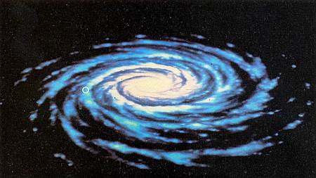 Наше Солнце является одной из 200 миллиардов звезд Галактики. Оно расположено на расстоянии 30 000 световых лет от центра Галактики и совершает один оборот вокруг него за 200 миллионов лет. Кружком отмечено положение Солнца в Галактике.