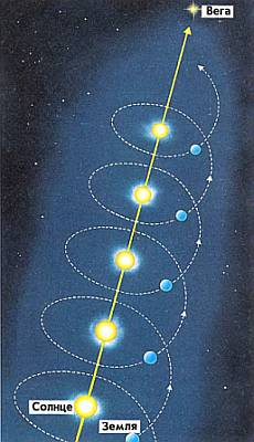 Солнце со скоростью 19 км/сек движется в сторону звезды Вега. Орбита Земли при этом похожа на спираль.