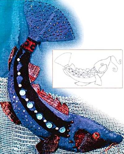 Главный персонаж панно — большая синяя рыба, выполненная в технике аппликации. Ее нужно выкроить из темно-синего шелка по эскизу. Снизу подшейте подкладку и по форме 4 проложите отрезок синтепона. Он придаст вашей рыбе объем.