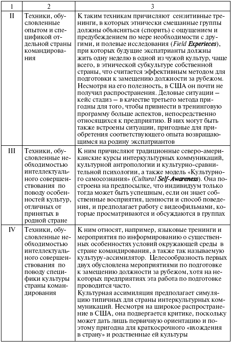 Интеркультурный тренинг необходим всегда, если при командировании работника за рубеж предполагается его контакт с другими культурами. При частом командировании целесообразно разрабатывать программу систематического интеркультурного тренинга, в процессе которой сотрудники изучают встроенные в нее модули. Преимущества разработки такой программы – во-первых, снижение проблем при проведении подготовительных мероприятий, на которые при отъезде работника за рубеж часто не хватает времени; во-вторых, меньший риск при внеплановом замещении сотрудников в зарубежном филиале; в-третьих, большая готовность к работе за границей сотрудников головного предприятия, если они систематически привлекаются к зарубежным контактам и увеличивающимся интеркультурным компетенциям при зарубежных замещениях. Недостаток программы – затратность при ее формировании и реализации, что, однако, окупается ее результативностью.