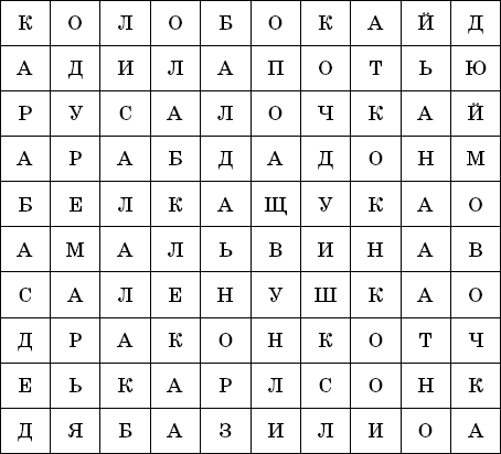 Начертите на большом листе бумаги таблицу, впишите по горизонтали и вертикали слова, относящиеся к какой-либо общей теме (овощи, фрукты, дом, школа, игрушки, имена...) (в каждую клеточку вписывайте по одной букве). Клеточки, оставшиеся пустыми, заполните любыми буквами. Ребенку нужно найти и прочитать слова, которые вы «спрятали». Если ребенку сложно искать слова по теме, попросите находить называемые или загадываемые вами слова («Найди слово РУСАЛОЧКА», «Найди имя героя, который живет на крыше»). Задание развивает осмысленность чтения, так как кроме слов-отгадок ребенок может увидеть в таблице и бессмысленные слова – АМАЛЬ, ЛЯБА, ОЛАБ и др.