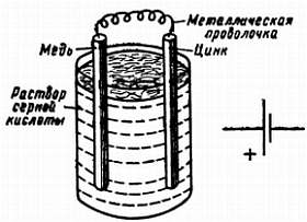 Ты можешь легко превратить химическую энергию в электрическую. Опусти в раствор серной кислоты стержень из меди и стержень из цинка. Сразу же химические реакции сделают цинк отрицательным относительно меди. Соедини проволочкой выступающие из раствора концы этих стержней, и по ней от цинка к меди потечет электрический ток.