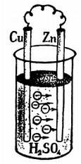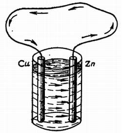 Рис. 8. Электрический элемент и его условное обозначение. Стрелками показано направление потока электронов, идущего от отрицательного полюса (цинк) к положительному (медь).