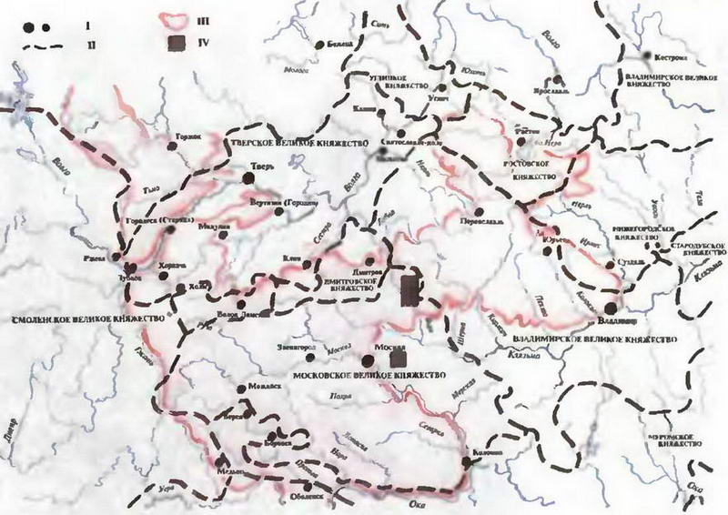 Территория Северо- Восточной Руси и расположение земель, освоение которых приходится на вторую половину XIII-XIV веков: I - города; II ~ границы княжеств на середину XIV века; III — моренные возвышенности, активно осваивавшиеся земледельческим населением (показаны вплоть до границ Смоленского княжества); IV — районы, детально исследованные археологически: Пехорский стан (к востоку от Москвы) и волости Радонеж, Бели и Веря (на северо-востоке Московского княжества).