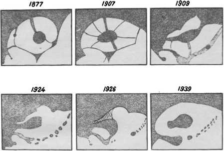 Такие изменения повторяются каждый год, и зачастую они сопровождаются переменой не только цвета, но и формы марсианских морей. Посмотрите, как изменялось Озеро Солнца на Марсе, наблюдавшееся многими в разные годы и разные сезоны. Не только глаз наблюдателя, но и фотография фиксирует эти загадочные изменения. Сравнивая фотографии Марса, полученные в 1909 и 1924 годах, астрономы обнаружили, например, что границы Моря Сирен и Киммерийского моря за это время сместились в среднем на 600 километров.