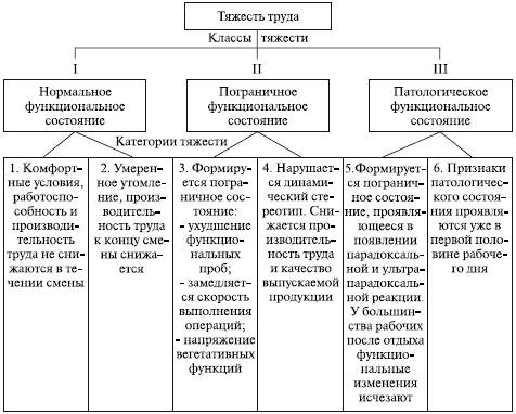 По своему биологическому значению для организма человека все функциональные состояния могут быть отнесены к одному из трех классов – нормальному, пограничному (переходному между нормой и патологией) и патологическому. Эти три функциональных состояния соответствуют трем классам тяжести труда. Каждый класс делится на две категории, которые более точно характеризуют тяжесть труда (рис. 7.2).