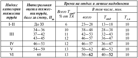 Суммарное время на регламентированный внутрисменный отдых и личные надобности устанавливается с учетом коэффициента тяжести труда. Помимо установления суммарного времени на отдых не менее важным является его правильное распределение в течение рабочей смены.