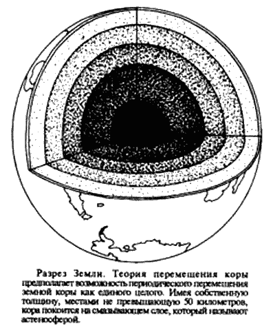 Читая эти слова, я вспоминал Чарлза Хэпгуда. Он сравнивал наружную тонкую, но жесткую кору земли, которую геологи называют литосферой, с коркой апельсина, и утверждал, что временами она может проскальзывать вся, целиком по жидкой части адра (как если бы между коркой и дольками была жидкая прослойка).