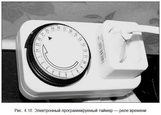 Тревожными признаками наличия у птицы дискомфорта являются ее «скованное» малоподвижное состояние, нахохлившиеся тело и крылья, головка, упрятанная в шейное оперение. Если такое наблюдается в вашем курятнике, немедленно увеличьте там температуру окружающего воздуха. Это можно сделать с помощью простого тепловентилятора, подключенного к реле времени (рис. 4.18). Такое недорогое электронное устройство (около 150 руб.) можно купить сегодня в любом магазине товаров для дома или электротоваров, а польза от него в приусадебном хозяйстве несказанная.