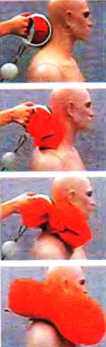 СПАСЕНИЕ ЗА МГНОВЕНИЕ. Оригинальную спасательную систему разработали немецкие специалисты. Как она работает, показано на снимках. Достаточно поднести к шее человека контейнер с компактно уложенным спасжилетом и дернуть за шнурок, как сжатый газ из баллончика раздувает спасательный жилет (скорее даже ошейник), и он оказывается надет на человеке.