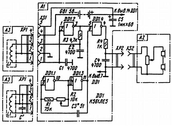 Напряжение питания подается на микросхему через контакты 2, 4 соединителя XS1 при подключении сменной катушки. Батарея GB1 содержит четыре последовательно соединенных аккумулятора Д-0,1.