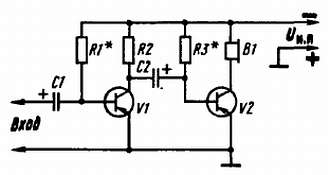 В первом каскаде усилителя работает транзистор V1, во втором — транзистор V2. Здесь первый каскад является каскадом предварительного усиления, второй — выходным. Между ними — разделительный конденсатор С2. Принцип работы любого из каскадов этого усилителя одинаков и аналогичен знакомому тебе принципу работы однокаскадного усилителя. Разница только в деталях: нагрузкой транзистора V1 первого каскада служит резистор R2, а нагрузкой транзистора V2 выходного каскада — телефоны В1 (или, если выходной сигнал достаточно мощный, головка громкоговорителя). Смещение на базу транзистора первого каскада подается через резистор R1, а на базу транзистора второго каскада — через резистор R3. Оба каскада питаются от общего источника Uн. п, которым может быть батарея гальванических элементов или выпрямитель. Режимы работы транзисторов устанавливают подбором резисторов R1 и R3, что обозначено на схеме звездочками.