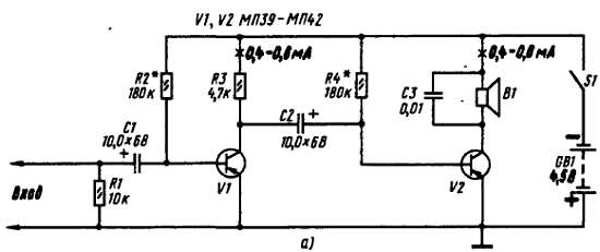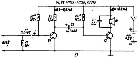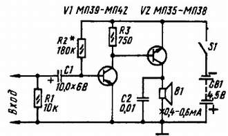 Надеюсь, ты понял, что мои советы по налаживанию двухкаскадного усилителя в равной степени относятся к обоим его вариантам. И если коэффициенты передачи тока их транзисторов будут примерно одинаковыми, то и громкость звучания телефонов — нагрузок усилителей должна быть одинаковой. Но, как я уже говорил, нагрузкой усилителя может быть телефонный капсюль ДЭМ-4м или абонентский громкоговоритель. Режим работы выходного транзистора при этом должен измениться. С капсюлем ДЭМ-4м, сопротивление которого 60 Ом, ток покоя транзистора каскада надо увеличить (уменьшением сопротивления резистора R4) до 4–6 мА, а с абонентским громкоговорителем (сопротивление первичной обмотки его согласующего трансформатора, используемого как выходной трансформатор, еще меньше) — увеличить до 8-10 мА.