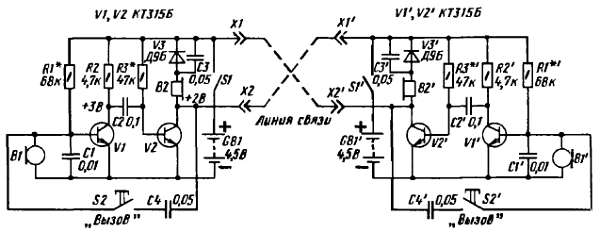 При включении питания выключателем S1 положительное напряжение батареи GBI подается на коллектор транзистора V2 через линейный провод, соединяющий разъемы X1 и Х2', телефон В2', открытый в это время диод V3' и далее через второй линейный провод, соединяющий разъемы Х1' и Х2. Диод V3' остается открытым все время, пока контакты выключателя S1 замкнуты. Конденсатор С3' шунтирующий диод V3', уменьшает падение переменной составляющей на его внутреннем сопротивлении, благодаря чему телефон B2' сигнал не искажает. А диод V3 первого аппарата в это время закрыт положительным напряжением питающей батареи и через него, а значит, и через телефон В2 коллекторный ток транзистора V2 не идет. Конденсатор С1 шунтирует вход усилителя по наиболее высоким частотам звукового диапазона и тем самым предотвращает самовозбуждение на этих частотах.