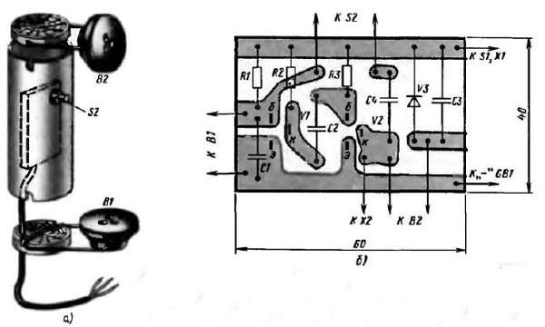 Рис. 178. Конструкция самодельной микротелефонной трубки (а) и плата усилителя телефонного аппарата (б)