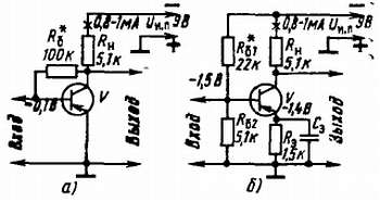 Один из способов термостабилизации режима работы германиевого транзистора структуры р-n-р показан на схеме рис. 179, а. Здесь, как видишь, базовый резистор Rб подключен не к минусовому проводнику источника питания, а к коллектору транзистора. Что это дает? С повышением температуры возрастающий коллекторный ток увеличивает падение напряжения на нагрузке Rн и уменьшает напряжение на коллекторе. А так как база соединена (через резистор Rб) с коллектором, на ней тоже уменьшается отрицательное напряжение смещения, что в свою очередь уменьшает ток коллектора. Получается обратная связь между выходной и входной цепями каскада — увеличивающийся коллекторный ток уменьшает напряжение на базе, что автоматически уменьшает коллекторный ток. Происходит стабилизация заданного режима работы транзистора.