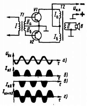Когда, например, на базе транзистора V1 отрицательная полуволна, он открывается и через секцию Iа первичной обмотки выходного трансформатора идет ток только этого транзистора (график б). В это время транзистор V2 закрыт, так как на его базе положительная полуволна напряжения. В следующий полупериод, наоборот, положительная полуволна будет на базе транзистора V1, а отрицательная — на базе транзистора V2. Теперь открывается транзистор V2 и через секцию Iб первичной обмотки выходного трансформатора идет ток его коллектора (график в), а транзистор V1, закрываясь, «отдыхает». И так при каждом периоде звуковых колебаний, подводимых к усилителю. В обмотке трансформатора коллекторные токи обоих транзисторов суммируются (график г), в результате на выходе усилителя получаются более мощные электрические колебания звуковой частоты, чем в обычном однотактном усилителе. Динамическая головка В, подключенная ко вторичной обмотке трансформатора, преобразует их в звук.