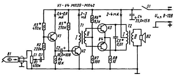 Усилитель четырехкаскадный, пятитранзисторный. Его первый каскад на транзисторе V1 является микрофонным усилителем второй и третий на транзисторах V2 и V3 — предварительным усилителем напряжения, четвертый выходной каскад на транзисторах V4 и V5 — двухтактным усилителем мощности. Транзистор V2 включен по схеме ОК, все остальные транзисторы — по схеме ОЭ.