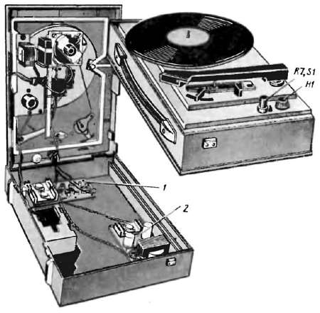 В твоем распоряжении может оказаться ЭПУ, вмонтированное в пластмассовый ящик, похожий на чемодан. Для воспроизведения грамзаписи при этом нужен радиовещательный приемник или телевизор, в которых предусмотрены гнезда для подключения звукоснимателя ЭПУ, или усилитель 3Ч с громкоговорителем на выходе.