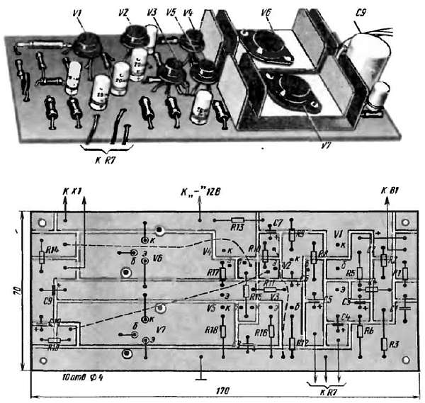 Размеры платы определяй по имеющимся деталям. Размечая отверстия для монтажных стоек или пустотелых заклепок, стремись к тому, чтобы соединительные проводники были возможно короткими. Проводники входной цепи должны быть возможно дальше от проводников и деталей выходной цепи. Иначе между ними через магнитные поля возникнет паразитная связь, из-за чего усилитель может возбудиться. Звукосниматель подключай ко входу усилителя экранированным проводом — проводом с гибкой металлической оболочкой. Экран этого провода можно использовать в качестве заземленного соединительного проводника. Трансформаторы, углубленные каркасами с обмотками в отверстиях в плате, приклей к плате клеем БФ-2.