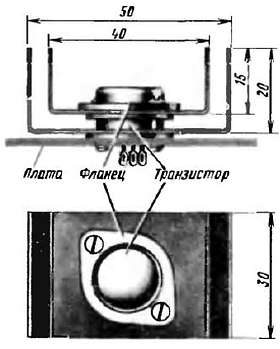Мощные транзисторы усилителя и стабилизатора напряжения блока пихания снабжены теплоотводами (радиаторами) П-образными пластинками из дюралюминия, плотно прилегающими к корпусам транзисторов (рис. 190).
