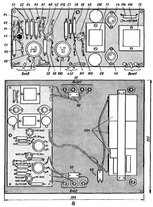 Рис. 193. Плата усилителя (а) и вид на сборочную панель сзади (б)