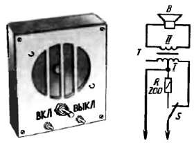 Переключатель S (тумблер) служит для включения и выключения радиоточки. Когда радиоточка выключена, вместо нее к линии подключается ее эквивалент резистор R сопротивлением 200 Ом. Это сделано для того, чтобы общая нагрузка усилителя оставалась всегда примерно одинаковой, независимо от числа включенных и выключенных радиоточек.