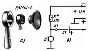 Рис. 195. Микрофон радиоузла на базе капсюля ДЭМШ-1 (а) и схема включения угольного микрофона (б)