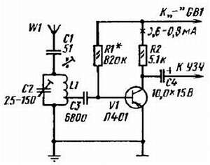Можно также использовать угольный микрофон, например капсюль МК-10 или МК-59, включив его по схеме, показанной на рис. 195, б. Здесь резистор R является ограничителем тока и одновременно нагрузкой капсюля. Напряжение звуковой частоты через зажим X1 и конденсатор C1 подается на базу транзистора V1 усилителя. Для питания такого микрофона используется батарея усилителя. Сопротивление ограничительного резистора надо подобрать опытным путем, добиваясь неискаженного звуковоспроизведения.