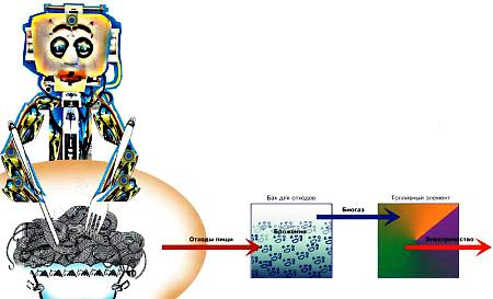 В реакторе робота, с которого мы начали рассказ, бактерии превращают продукты в биогаз, а топливный элемент превращает его в электроэнергию. Так что можно сказать, что робот питается мясом, а можно — солнечной энергией.