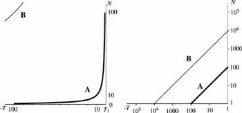 A: N=100/(T1-T), B: N=104(T1-T). T1 -- особая точка обострения роста, момент, в котором население стремится к бесконечности. На шкале логарифмов T1 как 0 не отображается